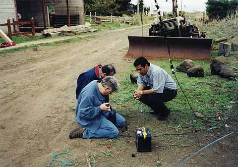 Jack, Roman and Eliazar working the Mediterranean on six meters. Notice the very large operating area with plenty of elbow room. The Zepp antenna, made from ladder line, was suspended over the tree branch above Eliazar. The IC706 MKIIG was running off the battery we brought from Santiago. Signals were very loud at times even though it was 12000 km to the Mediterranean.
