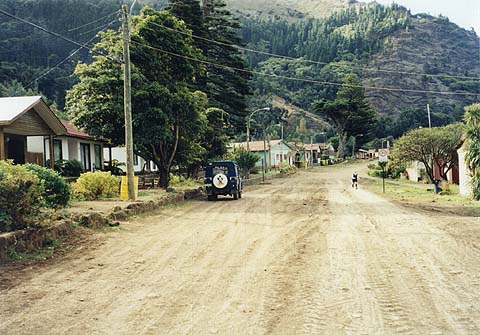 This is rush hour traffic on Jaun Fernandez. Actually there are about 6 or 7 vehicles on the island. Two of them are at the airport, most of them are Land Rovers and used for necessary tasks only. Gasoline is about $2.50 per gallon in Santiago and it has to be carried by boat to Juan Fernandez. This view is looking towards Eliazar's house at the end of the street and to the right a bit.