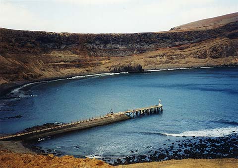 On the other end of the island we walked to this pier from the airport. The "Blanca Luz" would then take us to Cumberland bay and San Juan Batista, the only village on Juan Fernandez. This particular island was renamed in the 1960s as Isla Robinson Crusoe. It apparently helped the tourism here. About 900 SCUBA divers visit Juan Fernandez each year. Seals live in this particular bay as it sheltered from the strong southerly winds and ocean currents. The pier is essentially a large long plie of rocks contained with heavy wire screen and pilings. We assume the Chilean government was responsible for installing many of the more permanent structures on the island such as the piers and roads. There was bulldozer tracks at the airport which was brought in by ship sometime in the near past. Large amouts of water and rain erosion were visible everywhere.