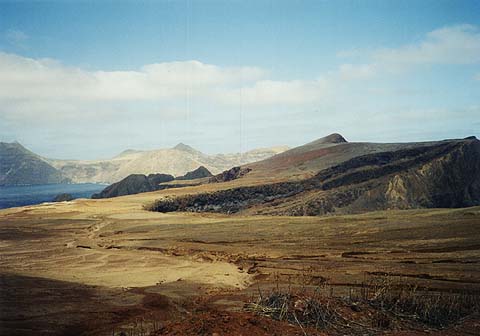 The west end of the island is very barren. Winds blow from the south most of the time. Vegitation is sparse and the only animals we observed were rabbits. The islands in this group are very young and of obvious volcanic origin. Many of the rocks have little apparent erosion. This was taken on the walk to the airport from the dock.