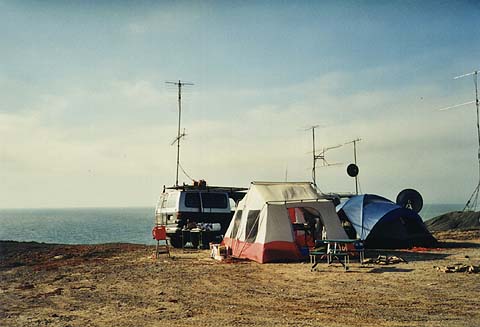 Operating and sleeping were done in the two tents. 144 and 432 were in the left tent. 50 and 222 MHz were in the right tent. The 4 KW generator is about where the picture was taken but to the right. Antennas were pointed up the coast towards Southern california. The closest contact was more than 200 miles (320 km) away.