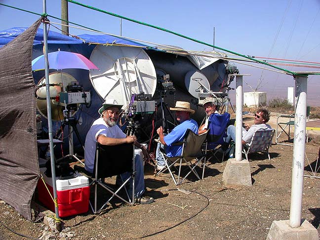Foto #1--Well, its Sunday pm and we finally are able to take a break from all the fast and furios activity...Yes, it took us longer to get to DM 10 xl than expected with a few stop in San Quintin first....Then when we go to the Hilltop, we encountered 20to 30 mile gusts of wind. So, the first thing was to plan out and scope out the site from where to set up and how to block the winds. We set up on a previous MW site that used to be fenced in and had about 8 hugh solar panels....but as u can see everything has been stripped off the site except the cement pilars...The old fence posts holes came in very handy to use to help set up the hugh duck blind!!! Notice Garys' dish--1.2m--is part of the duck blind too. Little did we know that all the cold wind, moist fog wa due to a hurricane down by La Paz which was sucking the winds in that direction. Heavy winds were also encoundered in Punta Baja DL 29 cx!!! from the same hurricane! Foto taken by K6dyd--Jerry