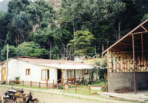 Eliazar's house is in the middle. The 40 and 80 meter dipoles above are suspended from various trees. His present church building is to the left and is called the "Casa de Oracion" or House of Oration, an evangelical church. The new church is under construction on the right. All wood is cut with a chain saw. Elizar built much of his house this way. His mast with the six meter yagi and tri-bander is on the left across the street.