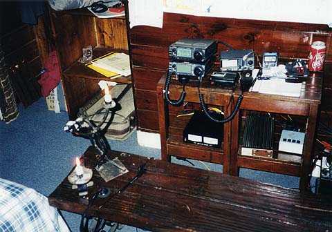 Here's the operating position in the hotel room. We ran a candle quite a bit of the time since the electricity went on and off frequently. The IC706s worked great. AC power for the hotel was from a temporary generator whose daily run time was directly proportional to the number of guests at the hotel.........hmmm. I think we burned up all of their candles as well. Great planning kept us on the air without a hitch as we ran from the battery and charged it continually when the electricity was on. We purchased the battery in Santiago and sold it to a couple of fishermen when we left.