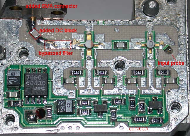 Virtually without any retuning these block converters will yield a 1.0 to 1.1 dB noise figure and about 27 dB of gain at 10368 MHz.. The only modifications are the removal of the DRO/mixer down converter assembly, the addition of an output connector and feed thru capacitor and jumpering over a 12 GHz band pass filter on the PC board. These mods can be implemented without any test equipment and unless you do something really dumb.......it will work........