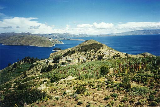 My favorite shot. Looking South toward the village from the operating location. The land South of the island is the peninsula leading to Copacabana, Bolivia. The land in the right background is Peru.