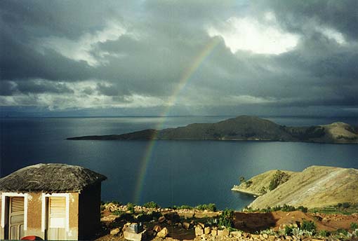 Looking West from the Hostal, a beautiful rainbow ends at the washpot next to the outhouse.