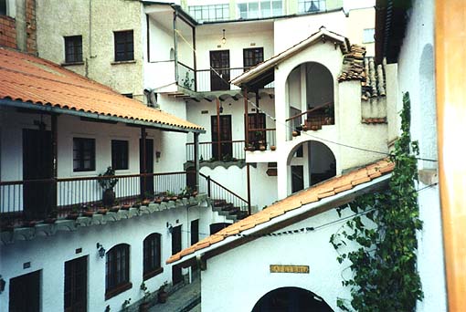 Courtyard in La Paz hotel. Six and ten meter Zepps are strung from room. Worked 17 LU's,. 3 PY's, 2 ZP's and 2 CX's from here in one evening. Radiation had to be going straight up because of surrounding building buildings and mountains