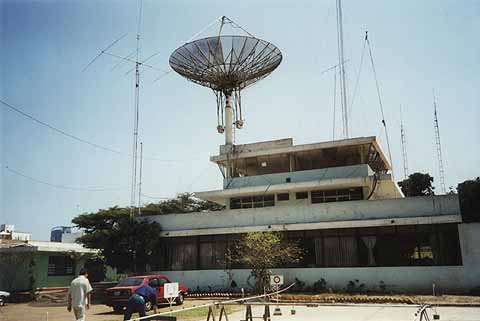 1. This very impressive facility in Lima is the Radio Club Peruano . This is the equivalent of the USA's ARRL headquarters. Besides the impressive assortment of antennas, the club has massive meeting facilities including lecture rooms, offices, operating suites and a restaurant. The temporary 6 meter beacon antenna is the horizontal dipole to the right of the dish.