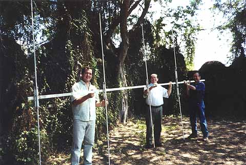 5. Pablo, Manuel, and Roman holding the stations 5 element 6 meter yagi. They are in process of adding the reflector and matching the driven element.