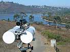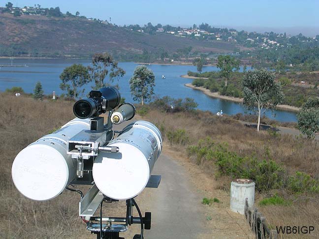 Kerry, N6IZW aiming laser Xcvr across Lake Murray