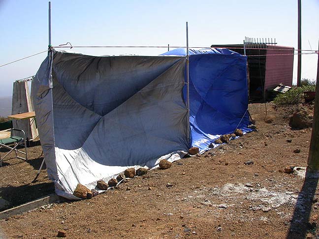 Foto#10--The famous duck blind --8 ft high to keep out the constant blowing winds and moist fogs...Notice how the tarps are blown inward---which was constant!!!Local Pumice rocks came in handy to hold the tarps down!