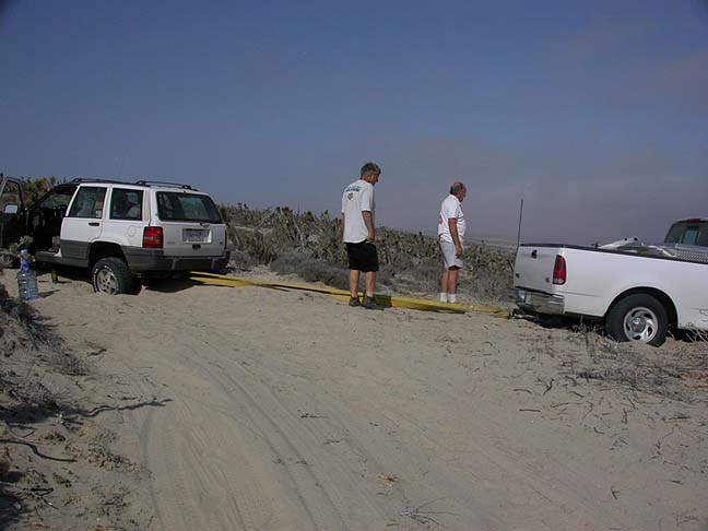 Foto # 12---Oh! My! what to do now! The thought that was running through the minds of Gary, who was stuck in sand up to and beyond his universal, Ken, with his 4 wd jeep, also stuck trying to pull Gary out and Jerry who came back to rescue the two!! Jerry, first pulled Ken out and then was able to get Gary out, but not before Gary had to dig out his truck with a with a small garden trowel!!!