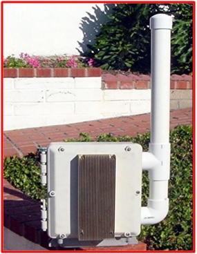 A coax transmission line carries the RF drive to the PA; which is (shown above) located in an outdoor housing atop the building. The 27dBm output of the amplifier is connected to a piece of slotted guide which is directed toward the LA basin.
