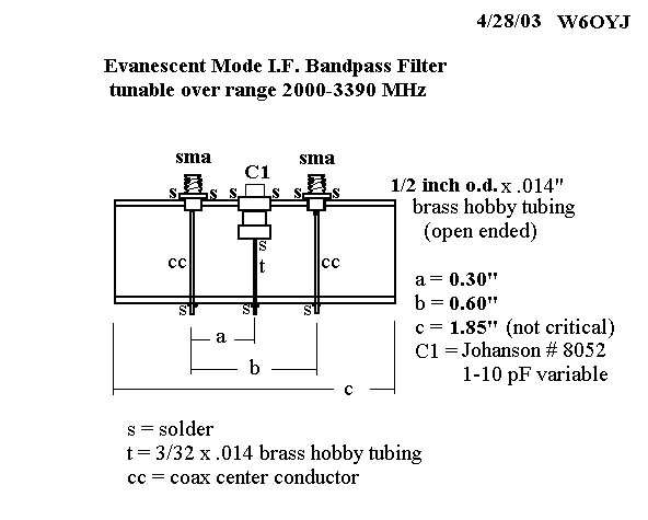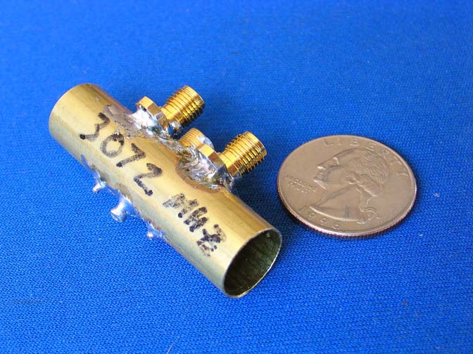 6A. New I.F. Bandpass Filters to interface between the 2-3 GHz Up/Down Converter Module and the Tx and Rx Modules. Two identical filters are needed. This filter is tunable over the 2000-3300 MHz range so it is suitable for either the Pcom Low side or High side LO modifications at 3072 or 2208 MHz respectively. The filter is made using 1/2 inch brass hobby tubing and easy to build. The tubing operates as circular waveguide below its cutoff frequency in the evanescent mode. The design is an extrapolation from the 1993 Microwave Update article by Reed Fisher, W2CQH, which used rectangular waveguide. See Photo A, and Photo B.