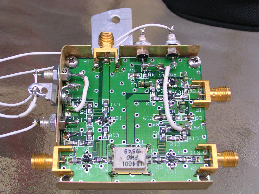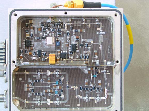 modules and the 2-3 GHz Up/Down converter (mixer board) nestled vertically to the