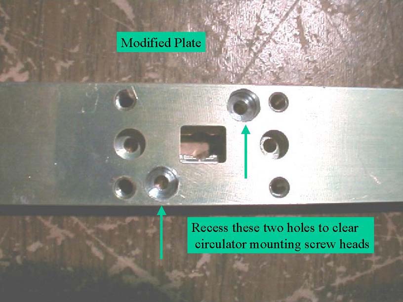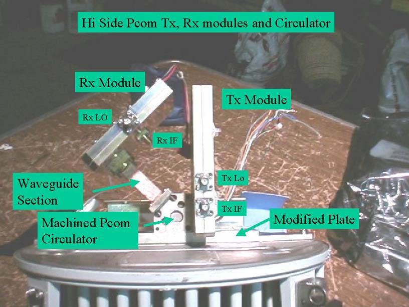9. Antenna Interface/RF Filter/and Modified ODU Mounting Plate. The 22/23 GHz waveguide RF filter in the original Pcom ODU is not used in this High Side LO conversion. Kerry found that the TX and Rx amplifiers at the 26.4 GHz LO frequency, and the 28.6 GHz image frequency are so lossy that no filter is needed. A circulator is used to provide the T/R isolation at 24 Ghz between the Tx and Rx Modules and the dish antenna. Kerry obtained a 24 GHz circulator, machined by Chuck Swedblom WA6EXV from one of the original Pcom 23 GHz isolators. A short piece of WR-42 waveguide is used to mount the Rx Module to the circulator, which itself is bolted directly to the Tx Module and a modified antenna mounting plate. A photo of these parts of the modified ODU assembly is shown. The modified circulator has its Rx port mounted at 45 degrees to the other sides of the circulator. A rectangular cube-shaped circulator could be used instead with an appropriate short section of WR-42 or a waveguide elbow.