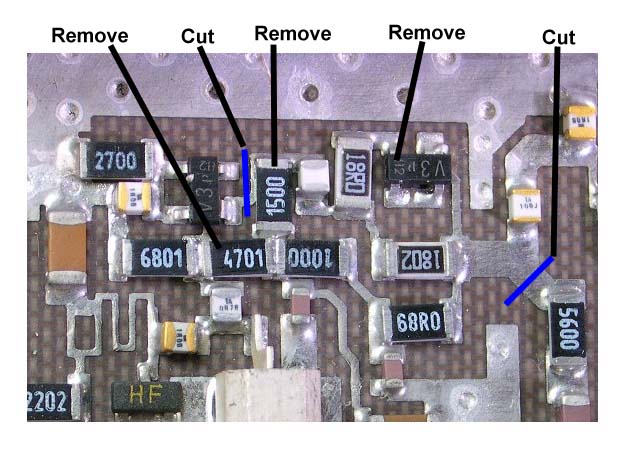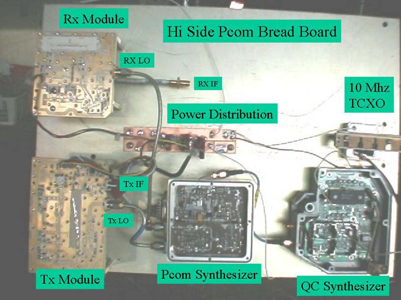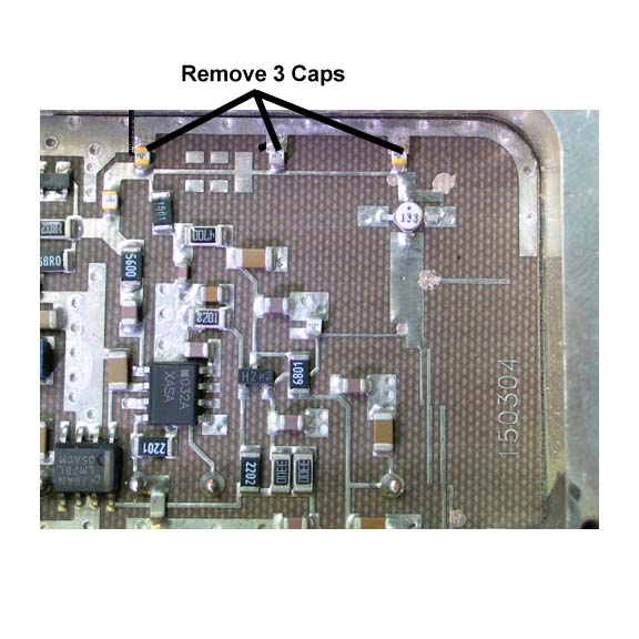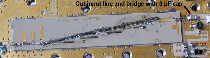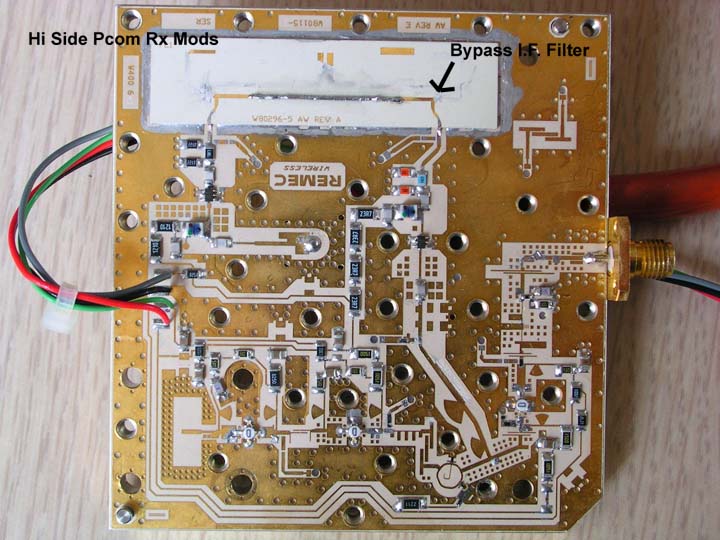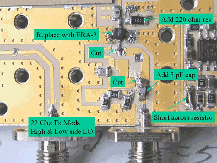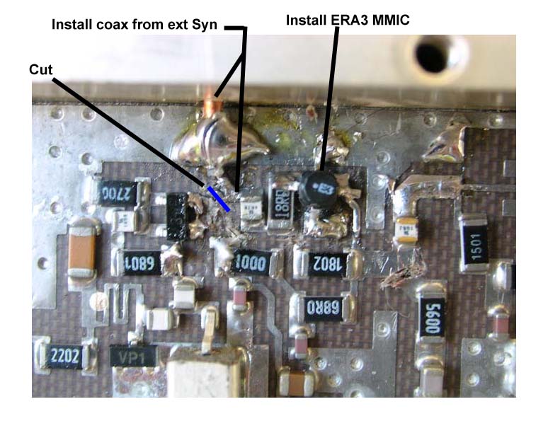 5. Modifying the Pcom Synthesizer Module. As mentioned above, the synthesizer portion of this Module is disabled in Step One by cutting traces and removing components. In Step Two, a new 2640 MHz input source to the VCO buffer stage is introduced via a coaxial line connected to one of the two outputs of the newly added separate Qualcomm DRO Synthesizer. Also in Step Two, the original VCO buffer stage is replaced with an ERA-3 MMIC to provide more gain. In Step Three, Remove three chip caps to increase the drive to the two X5 multipliers. No retuning of the X5 multiplier stages is needed in this High-Side LO modification. Their outputs provide ample (+20 dBm) LO/2 signal to drive the Tx and Rx Modules at 13,200 MHz. Finally in Step Four you add a power jumper in the lower right section of the module. The module power requirements are +12 Volts DC and Ground.