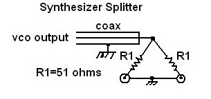5A. Qualcomm DRO Synthesizer for 2640 MHz. This unit is described elsewhere and an internal splitter is added to it to provide separate outputs to the Synthesizer Module and the 2-3 GHz Up/Down Converter Module. See photo of the modified synthesizer with the splitter at the very top, the external view of the splitter, the pcb view, and the splitter circuit diagram. Each 2640 MHz output should provide about +5 dBm. The power requirements are +12 Volts DC and ground.