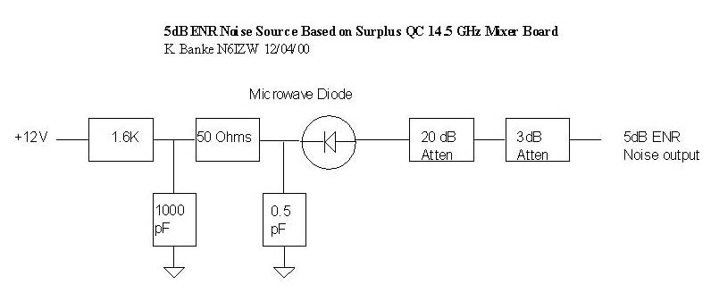 Connect the noise generator output through about 25 dB of attenuation to the setup which will be used to calibrate the ENR and adjust the supply voltage for maximum noise output at the maximum frequency of interest (I used 10368 MHz). Replace the 1k resistor with a resistor as required to operate the noise source at that current form the desired bias supply (I used a regulated 12V).